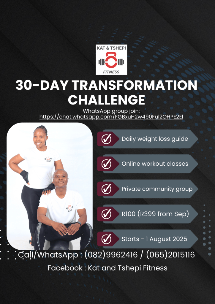 After payment : Send a screenshot of your successful payment / Proof of Payment via WhatsApp to Coach Tshepi- 0829962416 or Coach Kat- 0652015116 or email it to admin@katandtshepi.com. Once we receive your POP, you will be added to our private 30-day Transformation challenge WhatsApp group, where we share the daily lessons, challenges and Google Meet link 15 minutes before each class.