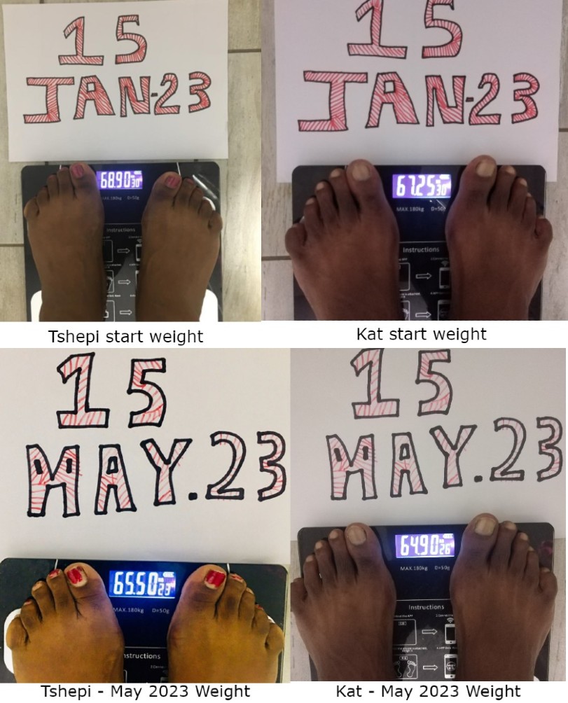 Our 4th month progress tracking was less than desired, we both failed to meet our 1 kg weight loss target. Kat started the journey 4 months ago weighing 67.25 kg , now he currently weighs 64.9kg which mean he has lost 3.25kg but his 4 months target was to lose 4kg. Tshepi started her journey with a weight of 68.9kg and now she weighs 65.50 kg, this equates to a loss of 3.4kg but her targeted weight loss by the 4th month was also 4kg. We both missed our 4th month target, it is a crushing and disheartening feeling 😦 as we don’t like to skip or miss our commitments in everything we do.