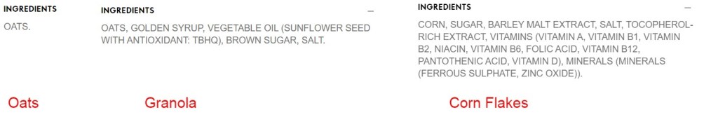 It takes a bit of time to get used to reading the back of products and to understand the real meaning of the provided information but it will make sense with familiarity and repetition. Here is a practical example of being faced with three breakfast options (Oats, Granola and Corn flakes) when you are trying to lose weight and to be healthy. Looking at the picture of the ingredients list for the 3 breakfast options and armed with the knowledge of reading ingredient lists, one can deduce that the first option makes better sense, Simplicity is better for weight loss.