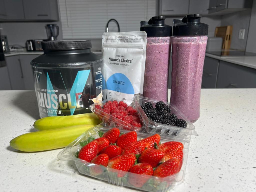 Earlier, we mentioned the protein and fruits breakfast shake we consume daily, this concoction is nutrient dense and packs a healthy punch, it is very low in calories and high in protein, and we also find it enjoyable. It provides 240 calories, 30g protein, 4g fat and 30g of carbohydrates, this is a good option for post-workout ,anytime snack or a meal replacement . Here are the ingredients: