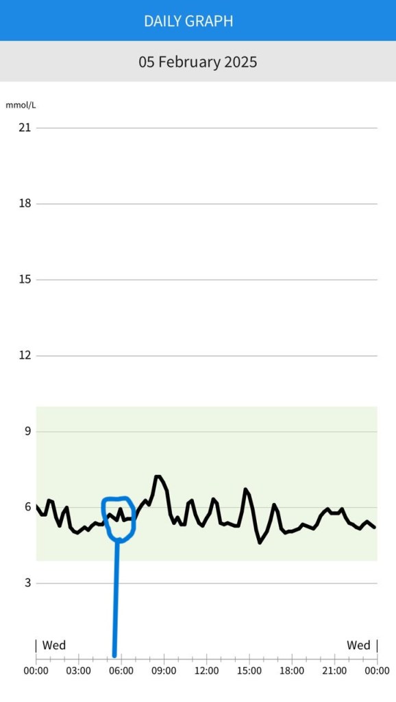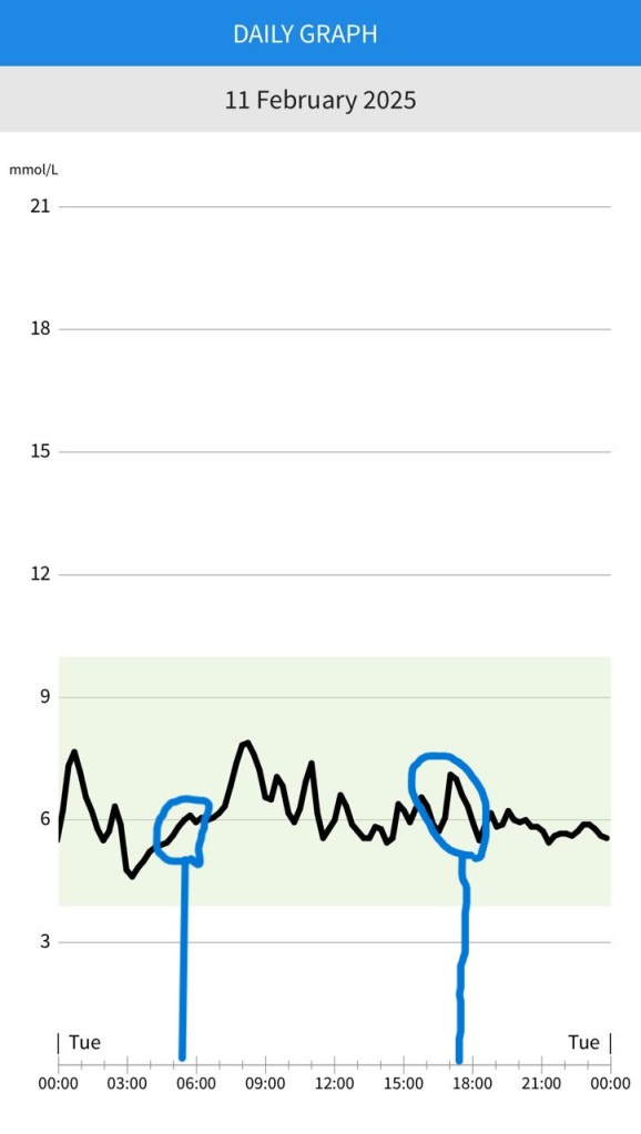 A CGM is a device that monitors and tracks your blood sugar throughout the day to help you with managing things that affects your blood sugar especially if you are diabetic. In the CGM readings, among other informative things we could see the rise in Tshepi’s blood sugar level whenever we exercised (see blue highlights below). This was a good indication that the body is making means for blood sugar (Glucose) to be available for use as energy, the blood sugar spike is not extreme but a rise nonetheless, and it confirmed what we knew , experienced and felt about energy levels and exercise.